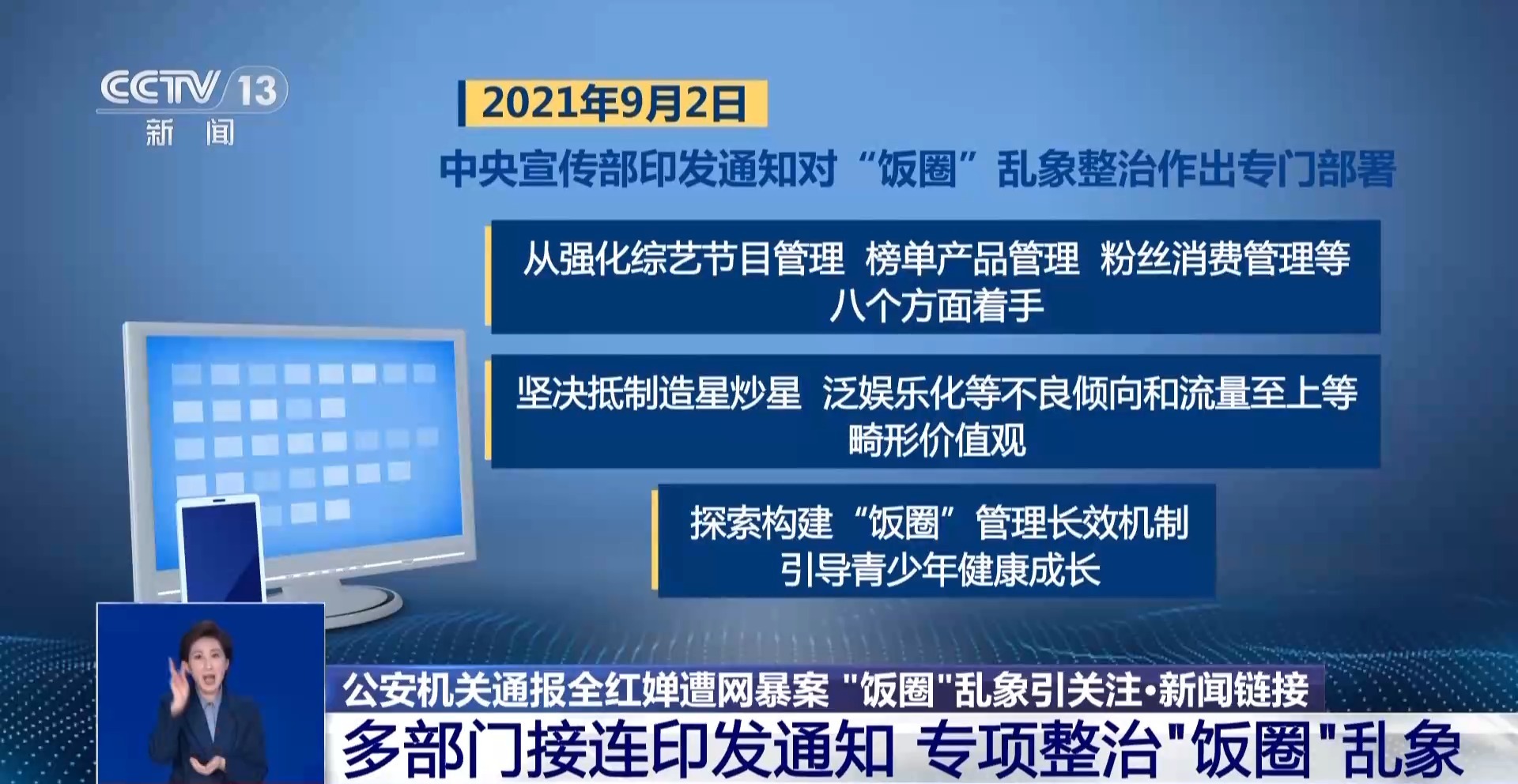2021年9月2日,中央宣傳部印發(fā)通知對(duì)“飯圈”亂象整治作出專門部署。從強(qiáng)化綜藝節(jié)目管理、榜單產(chǎn)品管理、粉絲消費(fèi)管理等八個(gè)方面著手,堅(jiān)決抵制造星炒星、泛娛樂(lè)化等不良傾向和流量至上等畸形價(jià)值觀,探索構(gòu)建“飯圈”管理長(zhǎng)效機(jī)制,引導(dǎo)青少年健康成長(zhǎng)。