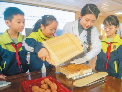 河北省滄州中西醫(yī)結(jié)合醫(yī)院,中藥師(右二)在為小學生演示中藥蜜丸的制作工藝。