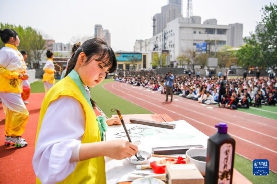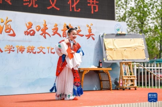 當(dāng)日,以“徜徉詩(shī)詞之海,品味文韻之美”為主題的傳統(tǒng)文化節(jié)在天津小學(xué)舉行。學(xué)生們?cè)诶蠋煹闹笇?dǎo)下參與國(guó)學(xué)朗誦、京劇選段表演、書畫展示等活動(dòng),感受傳統(tǒng)文化的魅力。