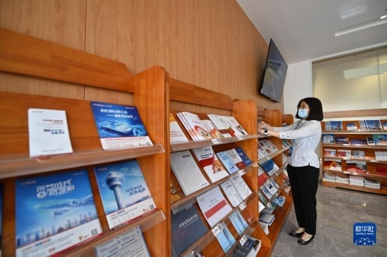 5月18日,工作人員在天開高教科創(chuàng)園內(nèi)的“金融超市”整理宣傳冊(cè)。