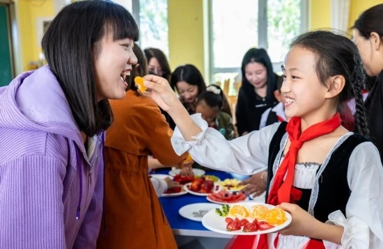 2023年5月12日,呼和浩特市玉泉區(qū)五塔寺東街小學(xué)學(xué)生請媽媽品嘗自己剛剛拼好的水果拼盤。通訊員 丁根厚 攝