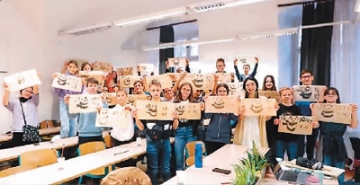 匈牙利羅蘭大學孔子學院下設(shè)埃格爾教學點多博·伊什特萬中學中文課堂的學生們展示繪畫作品。