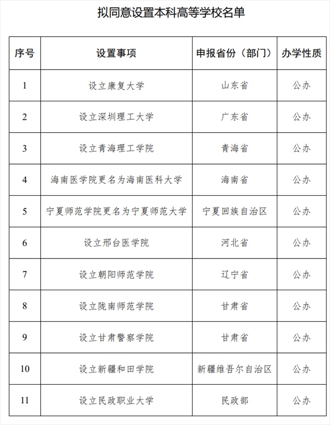 人民網(wǎng)北京5月15日電 (記者李依環(huán))教育部網(wǎng)站今天發(fā)布消息,根據(jù)高等教育法、《普通高等學(xué)校設(shè)置暫行條例》等有關(guān)規(guī)定以及第八屆全國(guó)高等學(xué)校設(shè)置評(píng)議委員會(huì)考察評(píng)議結(jié)果,經(jīng)教育部黨組會(huì)議審議,擬同意設(shè)置康復(fù)大學(xué)等24所學(xué)校。其中,2所高校更名,21所高校為新設(shè)、1所高校為轉(zhuǎn)設(shè)。