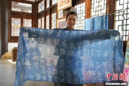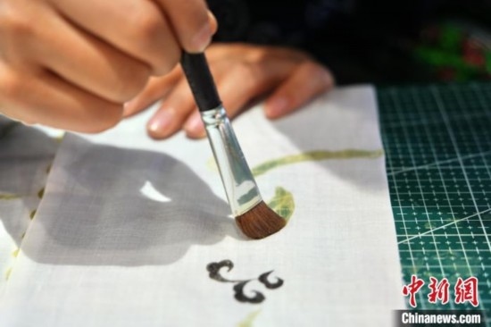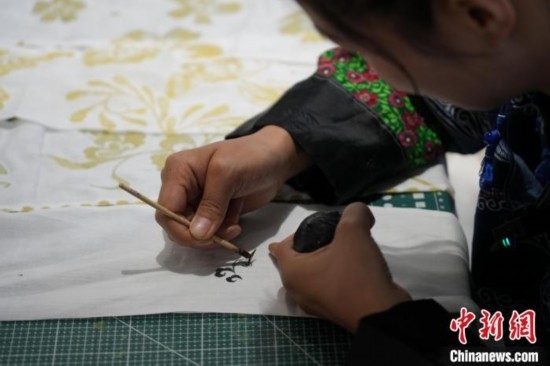 貴州織金苗族蠟染2021年6月入選國務(wù)院公布第五批國家級非物質(zhì)文化遺產(chǎn)代表性項(xiàng)目名錄?!?5后”苗族女孩王秋雨大學(xué)畢業(yè)后回到織金,成為一名織金苗族蠟染推廣者。她不僅使用傳統(tǒng)小臘刀,還使用大臘刀和毛筆,以蜂蠟為墨在絲巾、衣服、箱包上繪制小篆、甲骨文、山水等文字與圖案,這些蠟染產(chǎn)品深受消費(fèi)者喜愛。圖為6月19日,王秋雨在織金縣平遠(yuǎn)古鎮(zhèn)的依文織金數(shù)字化展廳制作蠟染。周燕玲 攝
