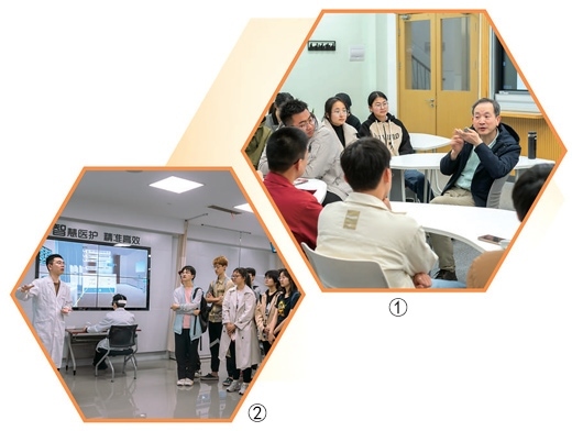 圖①:復(fù)旦大學(xué)“強(qiáng)國之路”思政大課小班討論課上,航空航天系教授艾劍良(右一)與學(xué)生交流。郭劍斌攝(人民視覺) 圖②:現(xiàn)場教學(xué)環(huán)節(jié),復(fù)旦大學(xué)上海醫(yī)學(xué)院學(xué)生在復(fù)旦大學(xué)附屬中山醫(yī)院了解智能醫(yī)療領(lǐng)域發(fā)展。張洪寅子攝(人民視覺)