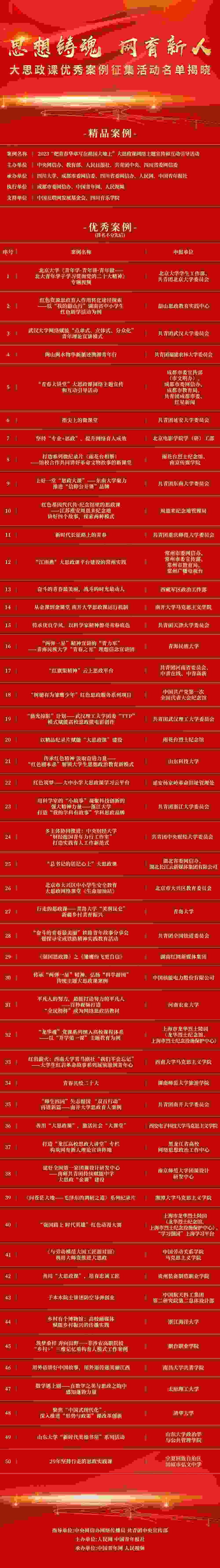 人民網(wǎng)北京2月10日電 (記者王鑫)由中央網(wǎng)信辦網(wǎng)絡(luò)傳播局、共青團(tuán)中央宣傳部指導(dǎo),人民網(wǎng)、中國青年報(bào)社共同主辦的“思想鑄魂 網(wǎng)育新人”大思政課優(yōu)秀案例征集活動(dòng)評選今天揭曉結(jié)果,經(jīng)初選、終選以及結(jié)果公示,產(chǎn)生精品案例1件、優(yōu)秀案例50件,名單如下: