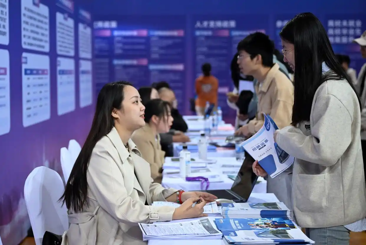 3月20日,環(huán)渤海城市聯合招聘高校畢業(yè)生春季專場活動在天津職業(yè)技術師范大學啟動,來自環(huán)渤海地區(qū)400多家企業(yè)提供崗位1.1萬個?;顒蝇F場還設立就業(yè)服務臺,為學生提供指導。圖為當日,求職學生(右)和招聘方代表在招聘會現場交談。新華社記者 趙子碩攝