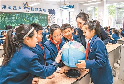 圖為老師帶領(lǐng)學(xué)生通過(guò)地球儀了解地球。