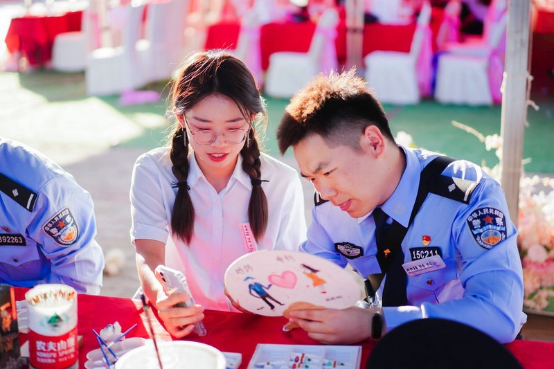 活動現(xiàn)場,布置溫馨浪漫,單身男民警與優(yōu)秀女青年歡聚一堂,在“電影配音”、“趣味問答”、“手繪團(tuán)扇”、“心動時刻”等廣大青年喜聞樂見的游戲環(huán)節(jié)中展現(xiàn)才藝,歡快互動、輕松交流,現(xiàn)場處處洋溢著幸福的喜悅。