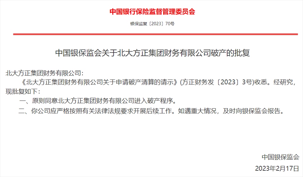 人民網(wǎng)北京2月21日電 (記者羅知之)據(jù)銀保監(jiān)會(huì)官網(wǎng)消息,銀保監(jiān)會(huì)今日發(fā)布了關(guān)于北大方正集團(tuán)財(cái)務(wù)有限公司破產(chǎn)的批復(fù)。批復(fù)指出,原則同意北大方正集團(tuán)財(cái)務(wù)有限公司進(jìn)入破產(chǎn)程序,該公司應(yīng)嚴(yán)格按照有關(guān)法律法規(guī)要求開展后續(xù)工作。