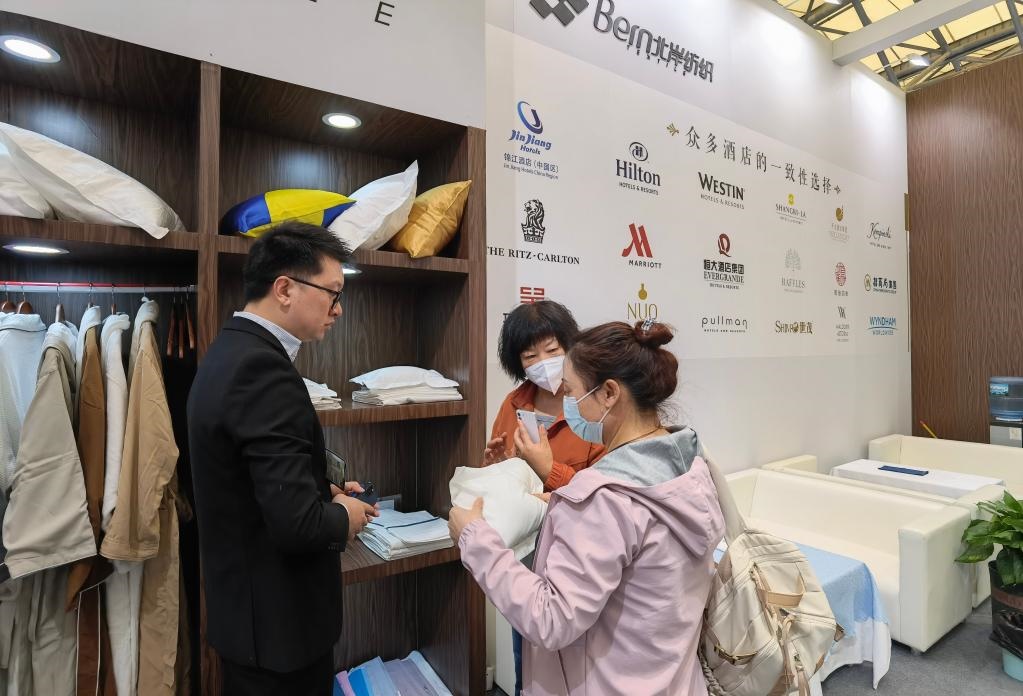 3月28日,觀眾在展會(huì)上詢問布草用品。新華社記者 陳愛平 攝