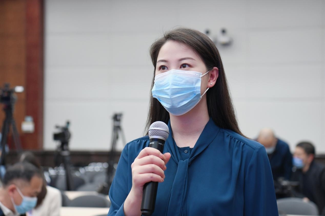 人民網(wǎng)記者任妍在2023年一季度財(cái)政收支情況新聞發(fā)布會上提問。中國財(cái)經(jīng)報余波 攝