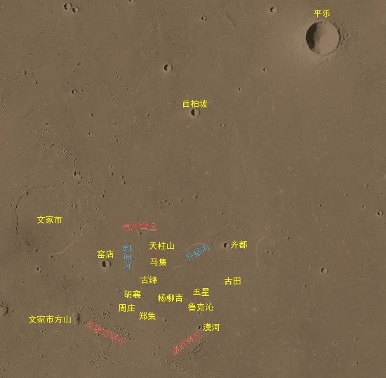 科學(xué)研究團(tuán)隊(duì)通過(guò)火星高分影像,識(shí)別了著陸點(diǎn)附近大量的地理實(shí)體,國(guó)際天文聯(lián)合會(huì)根據(jù)相關(guān)規(guī)則,將其中的22個(gè)地理實(shí)體,以中國(guó)人口數(shù)小于10萬(wàn)的歷史文化名村名鎮(zhèn)加以命名。將中國(guó)標(biāo)識(shí)永久刻印在火星大地。