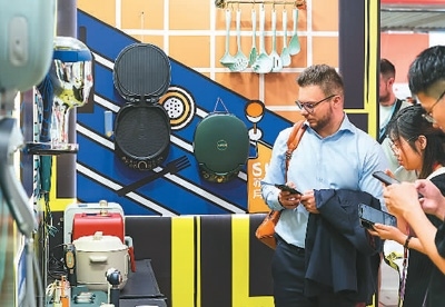 第133屆廣交會(huì),主辦方專門在客流量最大的展館主通道區(qū)域設(shè)置了一批中國(guó)工業(yè)設(shè)計(jì)展位。圖為境外采購(gòu)商正在了解一家中國(guó)工業(yè)設(shè)計(jì)企業(yè)的廚房電器產(chǎn)品。新華社記者 劉大偉攝