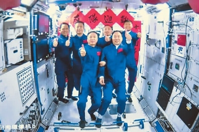 神舟十五號(hào)航天員乘組與神舟十六號(hào)航天員乘組拍下“全家福”。