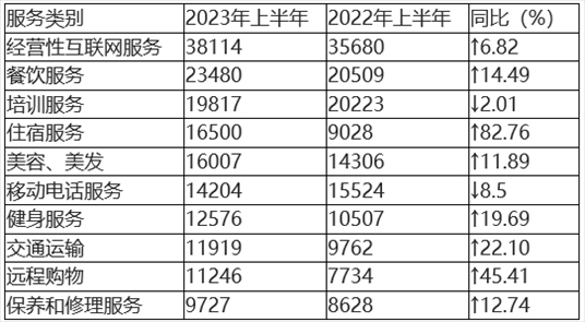 在具體服務(wù)投訴中,投訴量居前五位的分別為(如圖5、表5所示)經(jīng)營性互聯(lián)網(wǎng)服務(wù)、餐飲服務(wù)、培訓(xùn)服務(wù)、住宿服務(wù)、美容美發(fā)。與2022年上半年相比,住宿服務(wù)、遠(yuǎn)程購物、保養(yǎng)和修理服務(wù)進(jìn)入服務(wù)類投訴前十。其中,住宿服務(wù)、遠(yuǎn)程購物投訴量同比顯著增長(zhǎng),移動(dòng)電話服務(wù)投訴量同比有所下降。
