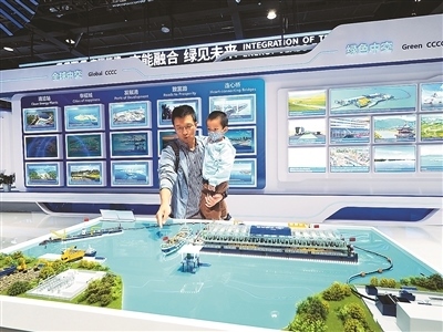 第十六屆國際交通技術(shù)與設(shè)備展覽會上,觀眾在中國交建展位參觀“太湖生態(tài)清淤工程”模型。杜建坡攝(人民圖片)