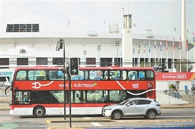 在智利首都圣地亞哥,一輛新能源公交車行駛在街頭。這條路線的十輛雙層新能源公交車由中國制造。近年來,中國制造的新能源汽車不斷進入智利市場,憑借綠色環(huán)保的特點和先進科技的應(yīng)用廣受當(dāng)?shù)孛癖姷那嗖A。新華社記者 辛悅衛(wèi)攝