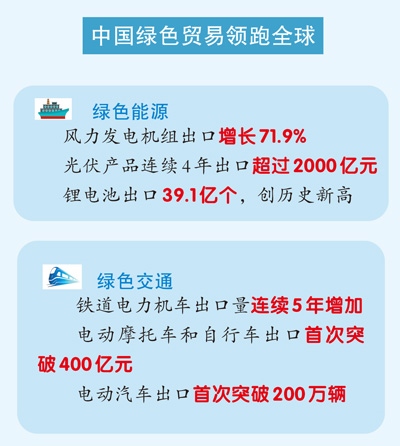 風(fēng)力發(fā)電機(jī)組出口增長(zhǎng)超七成;光伏產(chǎn)品連續(xù)4年出口超2000億元;鋰電池出口創(chuàng)歷史新高……海關(guān)總署新聞發(fā)言人、統(tǒng)計(jì)分析司司長(zhǎng)呂大良表示,2024年,中國(guó)綠色貿(mào)易領(lǐng)跑全球。中國(guó)綠色產(chǎn)品不僅豐富了全球供給,也為全球應(yīng)對(duì)氣候變化和綠色低碳轉(zhuǎn)型作出了巨大貢獻(xiàn)。