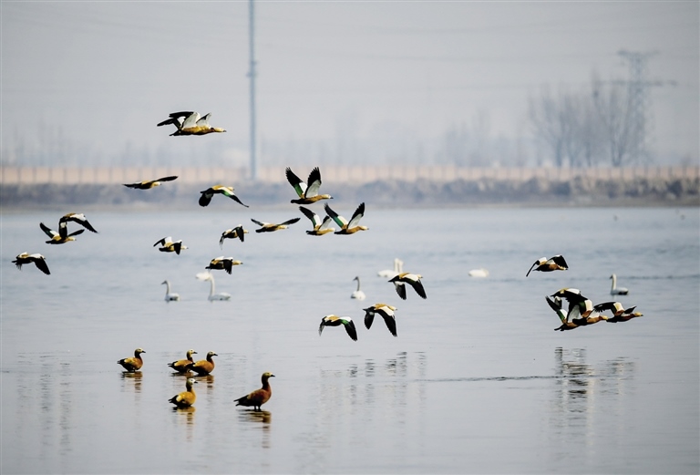 土默特左旗森林公安局副局長(zhǎng)王強(qiáng)告訴記者,隨著生態(tài)環(huán)境的日益改善,海流水庫已成為候鳥遷徙途中的重要棲息“驛站”,每年春秋兩季在海流水庫過境的候鳥高達(dá)百萬只,種類涉及天鵝、遺鷗、大雁、蒼鷺等十余種,其中不乏國家一、二級(jí)重點(diǎn)保護(hù)動(dòng)物。更可喜的是,現(xiàn)在海流水庫已經(jīng)有赤麻鴨長(zhǎng)期駐留。
