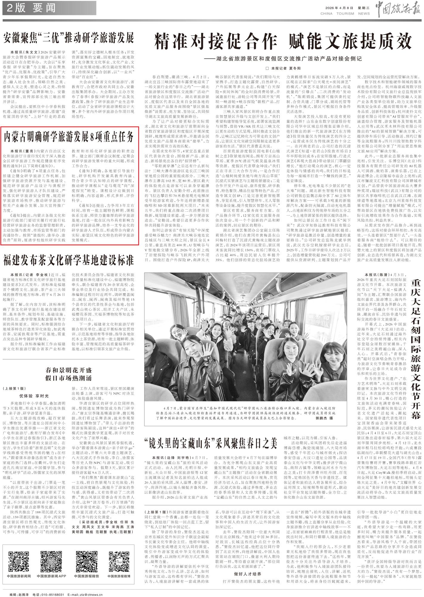 2026年4月8日《中國旅游報》2版刊發(fā)題為《內(nèi)蒙古明確研學旅游發(fā)展8項重點任務》的文章,報道了內(nèi)蒙古自治區(qū)文化和旅游廳日前印發(fā)《關于深入推進全區(qū)研學旅游工作規(guī)范健康有序發(fā)展的通知》明確了8項重點任務,包括建立健全研學旅游工作機制、加強研學旅游資源開發(fā)與基地建設等。