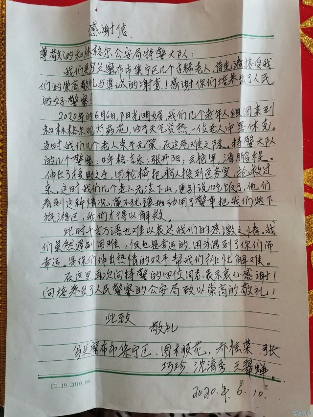 6月17日,呼和浩特市和林格爾縣公安局收到一個來自烏蘭察布市的快遞,收件人只寫著和林縣公安局,無具體部門與姓名。民警將其打開,里面竟是一面寫著“忠于職守、為民解憂”的錦旗、還有一封感謝信及一張合影照片。感謝信中寫道:此時千言萬語也難以表達(dá)我們的感激之情,我們雖然遇到困難,但也是幸運的,因為遇到了你們,是你們伸出熱情的雙手,幫我們排憂解難……