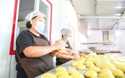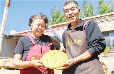 “我們堅(jiān)持手工制作,就是想留住這個(gè)味道!”常三文是隆盛莊月餅制作技藝非遺傳承人,他帶記者來(lái)到了打月餅的作坊。一個(gè)約60平方米的房間里有兩個(gè)大鐵鍋,一個(gè)鐵鍋里熬著糖水,另一個(gè)鐵鍋用來(lái)和面。一名男工將面粉、熟胡麻油、糖水等按比例倒入鐵鍋,然后用鐵鏟攪拌起來(lái)。鐵鍋旁邊是一個(gè)做月餅的大案板,4個(gè)女工稱重、分劑、做胚、擺放,各自忙活著。常三文的兒子常曉峰負(fù)責(zé)將擺放好的月餅放進(jìn)燒爐火的烤爐,計(jì)時(shí)、下簽子、刷油……直至月餅烤制完成出爐。