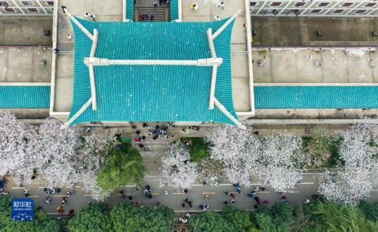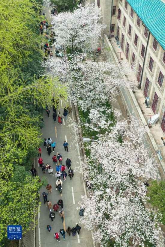 3月18日,來自各地的抗疫醫(yī)護(hù)人員及家屬在武漢大學(xué)校園賞櫻(無人機(jī)照片)。