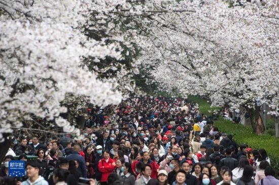 當(dāng)日,武漢大學(xué)舉行抗疫醫(yī)護(hù)賞櫻專場。珞珈山下,來自全國各地的1.6萬余名抗疫醫(yī)護(hù)人員及家屬赴約賞櫻。