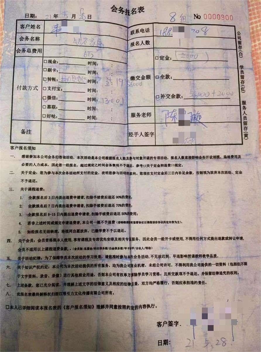 楊濤鳴的另一個(gè)弟子富麗有類似經(jīng)歷。2020年,繳納14萬(wàn)元后意識(shí)到“可能陷入騙局”,她找到吸引公司要求退款,拖延至今。