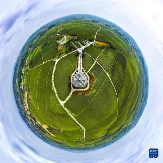 4月4日拍攝的遵義市湄潭縣永興鎮(zhèn)“萬畝茶?!保o人機全景拼接照片)。