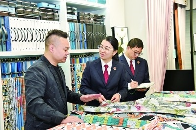 浙江省紹興市柯橋區(qū)被稱(chēng)為“國(guó)際紡都”。2022年,柯橋區(qū)人民檢察院通過(guò)大數(shù)據(jù)監(jiān)督模型,監(jiān)督糾正62件花樣著作權(quán)虛假訴訟案件,入選2022年知識(shí)產(chǎn)權(quán)檢察十大案事例。圖為辦案人員在走訪(fǎng)商戶(hù)??聵騾^(qū)人民檢察院供圖