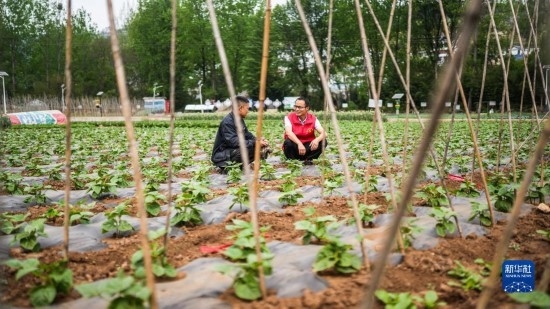 4月14日,農(nóng)技工作者在六盤水市鐘山區(qū)大河鎮(zhèn)大橋村和村民交流蔬菜種植技術。