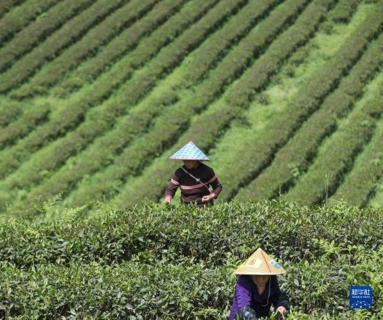 4月15日,村民在貴州省開(kāi)陽(yáng)縣南龍鄉(xiāng)田坎村一茶園采茶(無(wú)人機(jī)照片)。