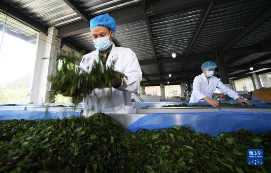 4月15日,在貴州省開(kāi)陽(yáng)縣南龍鄉(xiāng)翁朵村一茶葉加工廠,工人在攤晾茶青(無(wú)人機(jī)照片)。