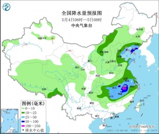 5月4日08時至5日08時,湖北南部和東部、安徽南部、湖南東北部、江西中北部、浙江西部、江蘇南部以及山東半島、遼寧南部、河北東部等地部分地區(qū)有大到暴雨,其中,安徽南部、江西北部等地部分地區(qū)有大暴雨(100~120毫米)。上述部分地區(qū)伴有短時強(qiáng)降水(最大小時降雨量20~40毫米,局地可超過50毫米),局地有雷暴大風(fēng)等強(qiáng)對流天氣。內(nèi)蒙古中部、黑龍江東北部、新疆南疆盆地、甘肅河西、山東半島等地部分地區(qū)有4~6級風(fēng),其中,新疆東部部分地區(qū)有8~9級風(fēng)。渤海、渤海海峽、黃海大部、東海北部海域?qū)⒂?~8級、陣風(fēng)9~10級的大風(fēng)。