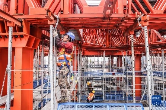 5月3日,中建三局的工人在海南中心項(xiàng)目的“空中造樓機(jī)”內(nèi)施工。