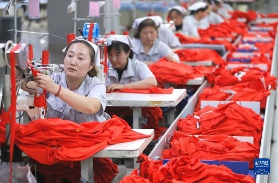 5月4日,在山東省青島市即墨區(qū)一家服裝企業(yè),工人生產(chǎn)出口到海外市場(chǎng)的服裝。