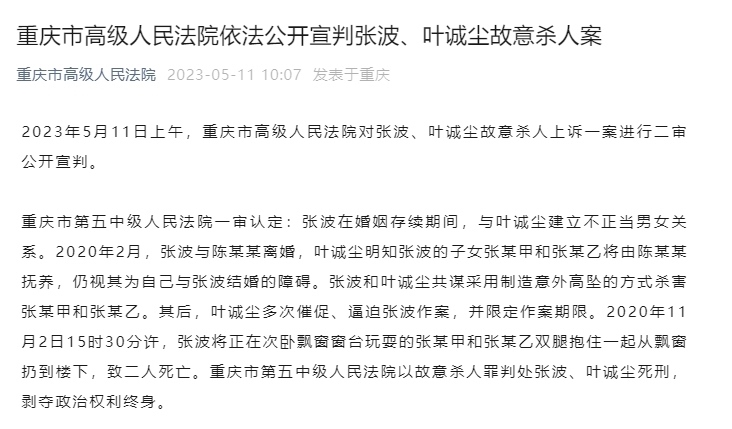·重慶市高級人民法院裁定張波、葉誠塵故意殺人案駁回上訴,維持原判。