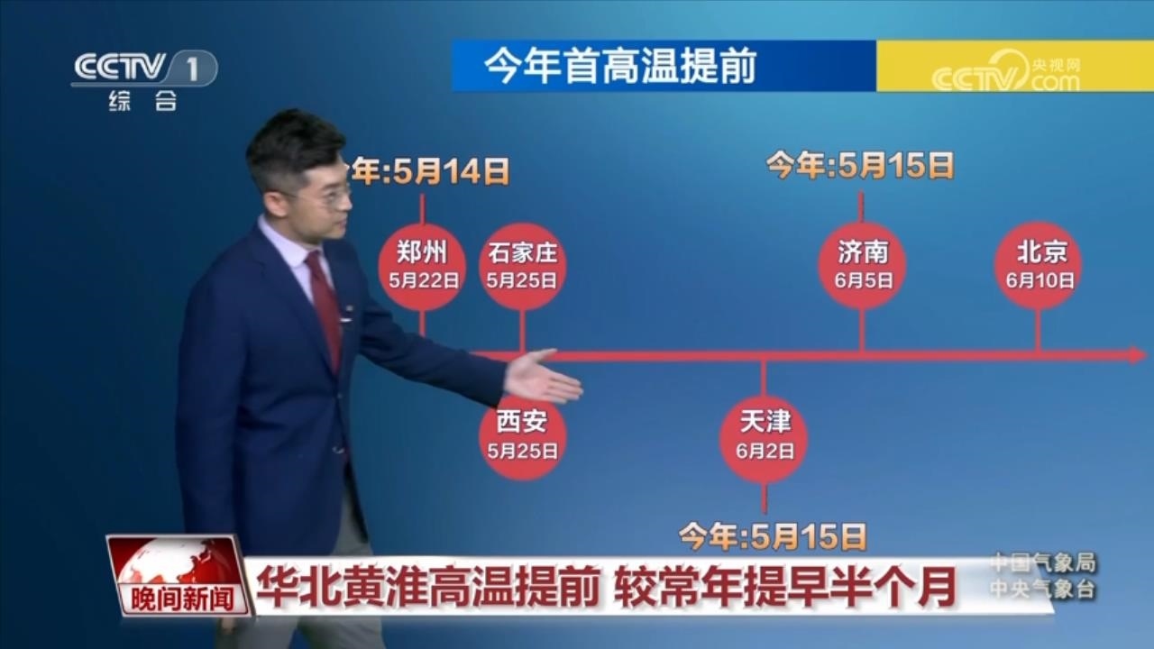 這輪高溫天氣過程,要比常年同期相對偏早。城市當中,鄭州在5月14日,以及天津和濟南在5月15日都已經出現(xiàn)了首個高溫日,而5月16日,石家莊和北京也有可能會出現(xiàn)高溫,要比常年同期偏早半個月左右。