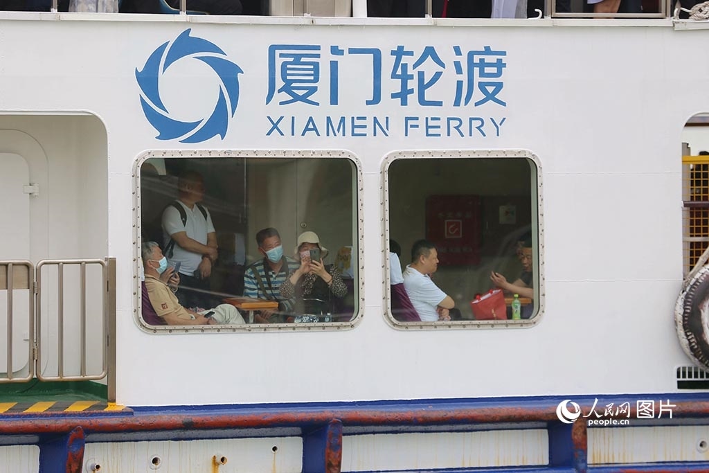 5月14日,廈門輪渡船??抗睦藥Z內(nèi)厝澳碼頭,船艙里的游客迫不及待地拿起手機拍照。人民網(wǎng)記者 陳博攝