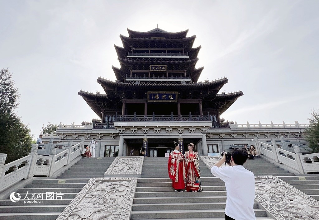 今年以來,濟南大明湖畔的“江北第一樓”超然樓因其獨特的人文氣息和景觀氣質(zhì)火爆網(wǎng)絡(luò),成為爆火“出圈”的網(wǎng)紅打卡地。5月16日,在大明湖超然樓前,身穿古代服飾打卡拍照的游客絡(luò)繹不絕,在山色與湖光之間盡展古韻美感。人民網(wǎng)記者 劉祺攝
