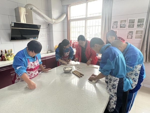 走進(jìn)陜西省渭南市特殊教育學(xué)校,手鼓聲、搟面聲、冰壺與地面摩擦聲此起彼伏;由教師扮演的“超市收銀員”正為“購物”的學(xué)生結(jié)賬;“自助取款機(jī)”前,幾位小朋友正排著隊(duì)學(xué)習(xí)如何存取現(xiàn)金;醫(yī)院“問診臺”、“掛號處”等模擬窗口應(yīng)有盡有……在這里,飽含愛心、耐心、責(zé)任心的教學(xué)態(tài)度和幫助特殊兒童自理、自立、自強(qiáng)的教育初衷滋養(yǎng)著每一名學(xué)生平安成長。