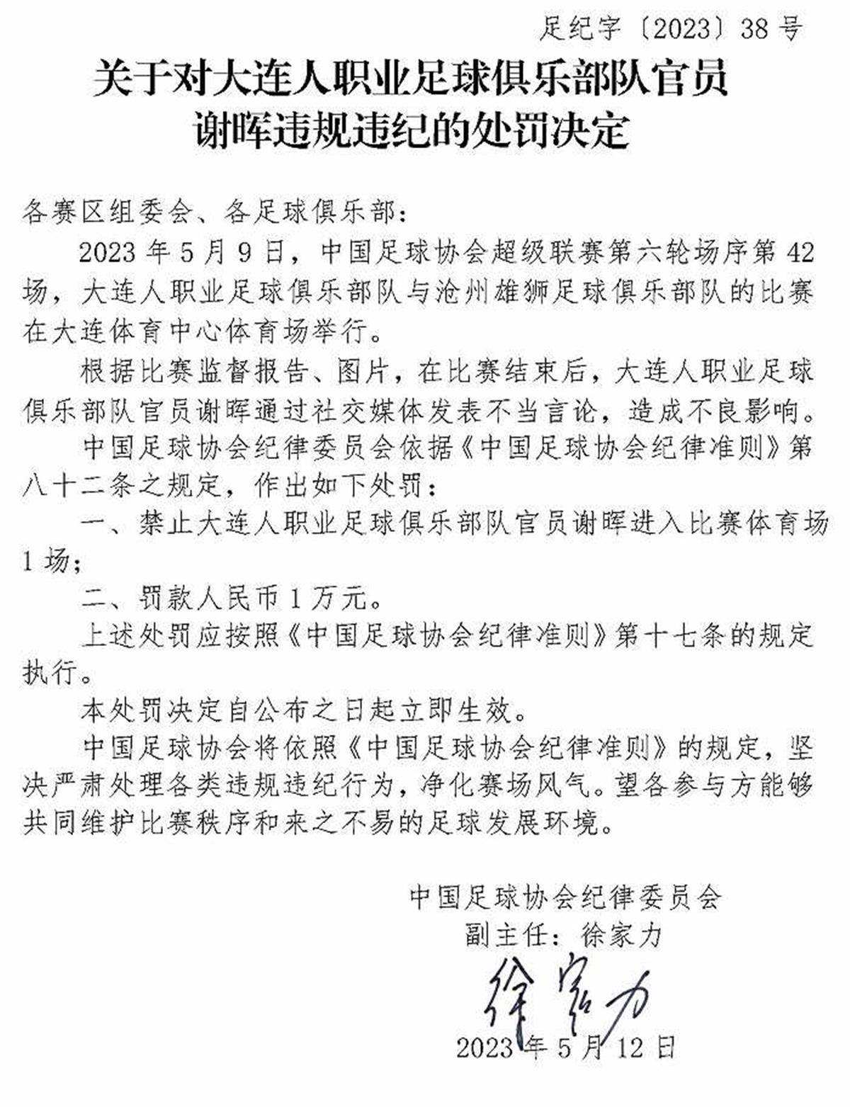 5月12日,中國足協(xié)紀(jì)律委員會(huì)接連開出三張罰單,對(duì)中超大連人隊(duì)的主教練謝暉,以及南通支云隊(duì)、黑龍江冰城隊(duì)的兩位俱樂部官員范兵和李鎮(zhèn)伯進(jìn)行了處罰,共計(jì)罰款5萬元,并對(duì)三人追加禁賽。這三張罰單一出,引來外界的一片質(zhì)疑聲。