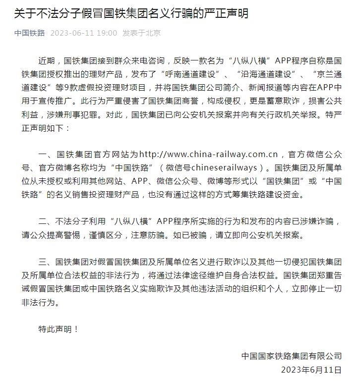 “中國(guó)鐵路”微信公眾號(hào)6月11日發(fā)布嚴(yán)正聲明稱,近期,國(guó)鐵集團(tuán)接到群眾來(lái)電咨詢,反映一款名為“八縱八橫”APP程序自稱是國(guó)鐵集團(tuán)授權(quán)推出的理財(cái)產(chǎn)品,發(fā)布了“呼南通道建設(shè)”、“沿海通道建設(shè)”、“京蘭通道建設(shè)”等9款虛假投資理財(cái)項(xiàng)目,并將國(guó)鐵集團(tuán)公司簡(jiǎn)介、新聞報(bào)道等內(nèi)容在APP中用于宣傳推廣。