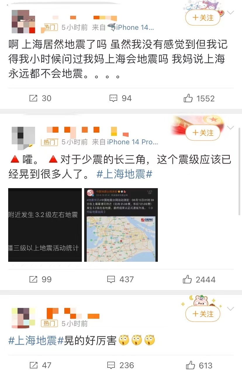 有網友表示,“床明顯在晃動”“持續(xù)了四五秒”“徐匯輕微有震感”,不過也有很多網友表示,“在睡夢中完全沒有感覺到”。