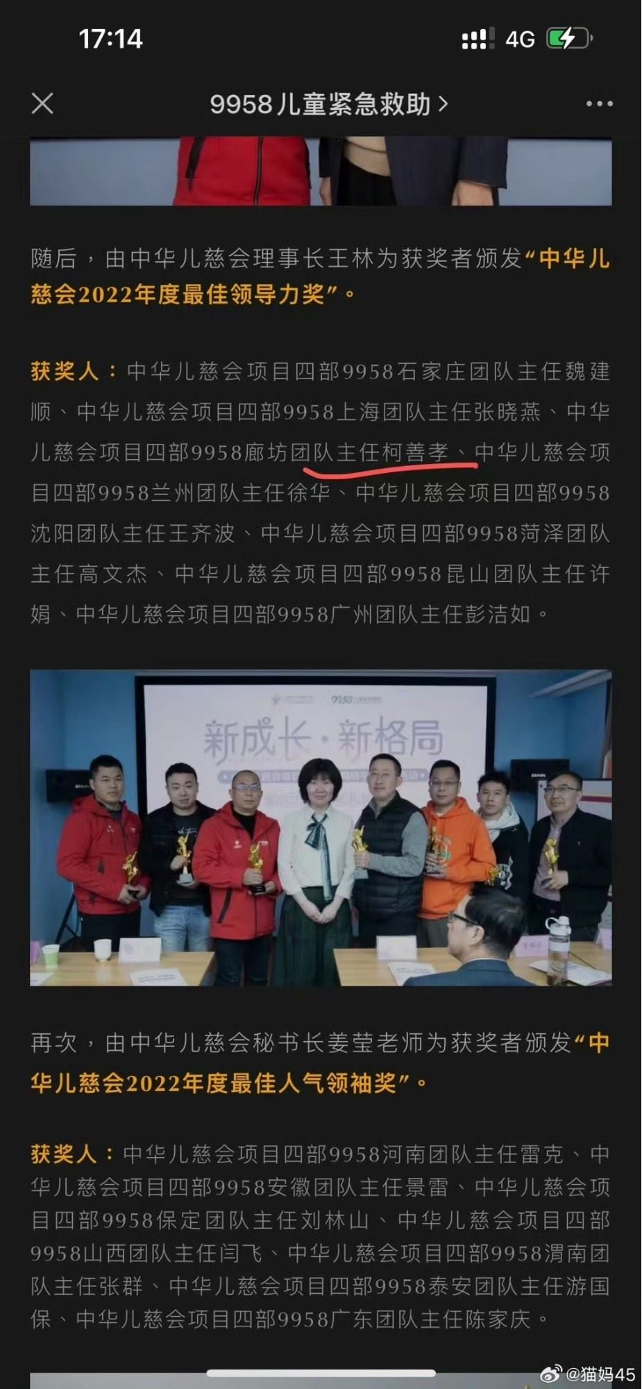 但對這份聲明,被騙家屬們并不認同。首先是涉案人員柯某孝的身份問題,此前中華兒慈會官方公眾號顯示,柯某孝為“中華兒慈會項目四部9958廊坊團隊主任”,獲“中華兒慈會2022年度最佳領導力獎”。目前,中華兒慈會官方公眾號文章已對這些內(nèi)容進行修改或刪除。