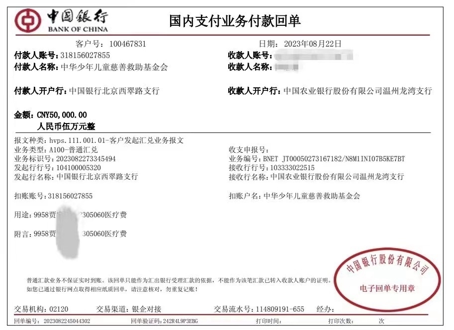 一位患者家屬提供給記者的銀行轉賬記錄顯示,8月22日的一張銀行的付款回單上,付款人名稱為:中華少年兒童慈善救助基金會,收款人名稱為患者家屬陳某某,單據(jù)上標注的用途為某某某醫(yī)藥費等字樣。收款金額為5萬元。
