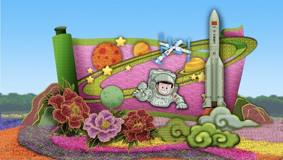 10,復(fù)興門東北角的“筑夢未來”花壇頂高8.5米,以中國航天員、空間站為主景,寓意航天強國建設(shè)蓬勃發(fā)展,助力中國夢早日實現(xiàn),全面推進(jìn)中華民族偉大復(fù)興,譜寫新時代中國特色社會主義更加絢麗的華章。