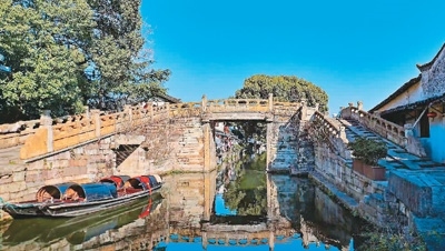 夕陽的余暉灑在寶珠橋上,烏篷船從拱形橋洞中悠然而過,河面蕩起層層漣漪。幾名身著漢服的姑娘在橋頭觀景、拍照,笑語連連。